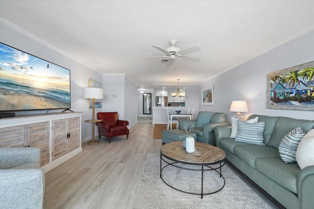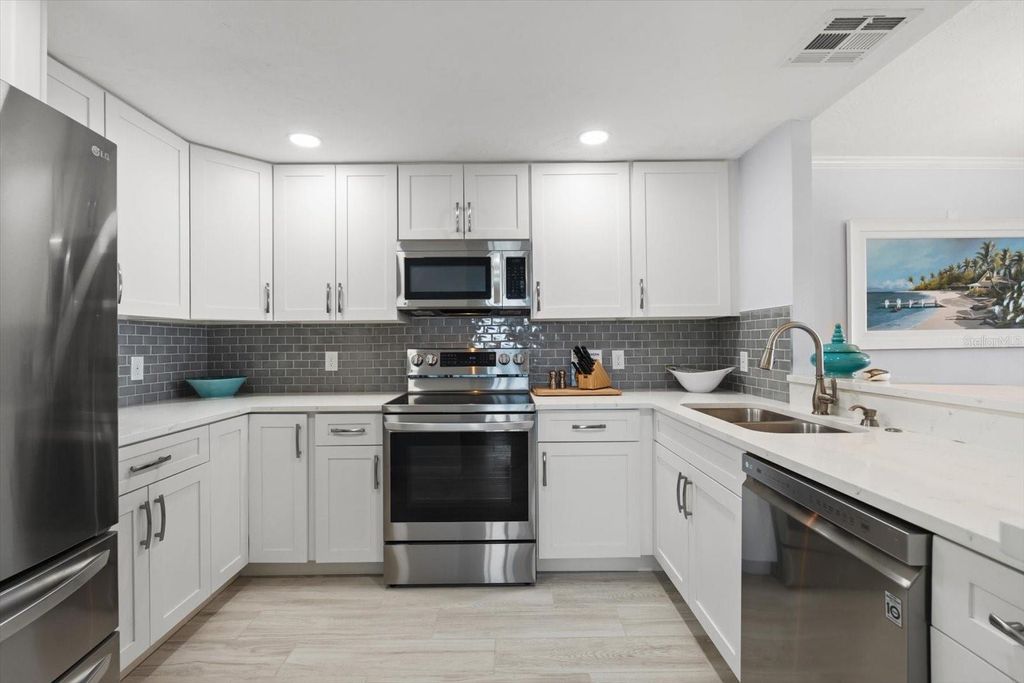 Magnificent water views! It is like watching a boat parade every day! Welcome to Peppertree Bay, a sought-after beach to bay community on Siesta Key. This pristine 2-bedroom 2-bath condo has been beautifully updated to appeal to the modern discerning buyer, with clean contemporary finishes showcasing its coastal charm. Step inside to find a spacious open floor plan incorporating gorgeous wide-plank tile flooring leading to a bright and cheery kitchen with stainless-steel appliances, white shaker-style cabinetry and quartz countertops. Both baths have been stylishly remodeled with the same cabinetry and quartz countertops. You'll want to spend all day on the 29-foot lanai with its stunning views of the bay and all the beautiful wildlife that live and play there. Peppertree Bay features resort-style amenities like private beach access, two heated pools, tennis courts, pickleball courts, two clubhouses, fitness center and fishing pier. With onsite management and rental desk, this condo is the perfect coastal retreat or savvy investment. Enjoy the all new spectacular landscaping as you enter Peppertree.