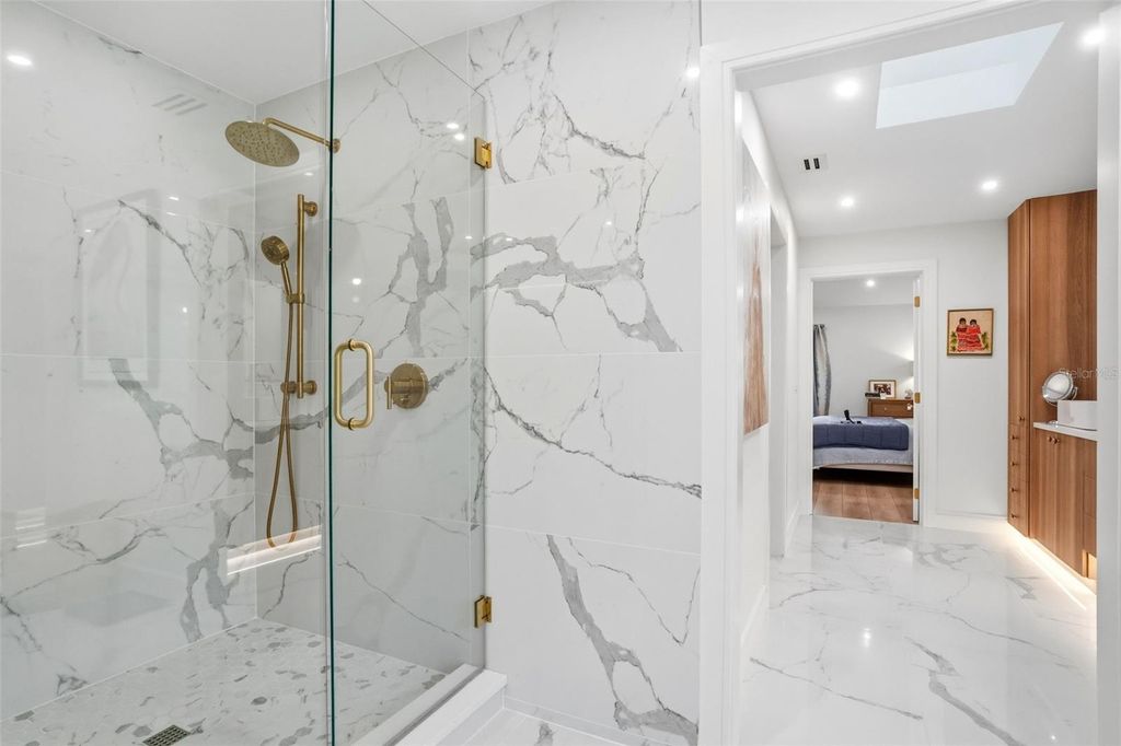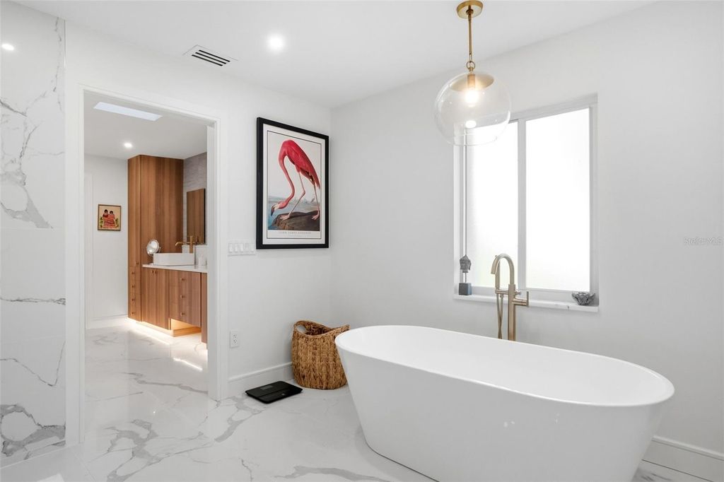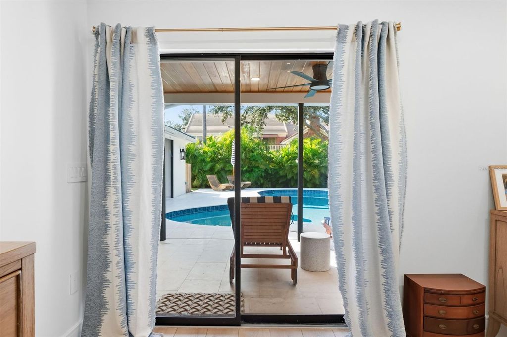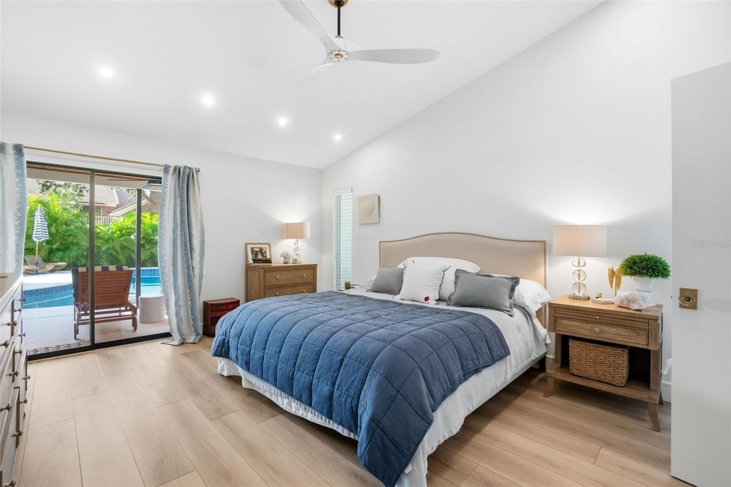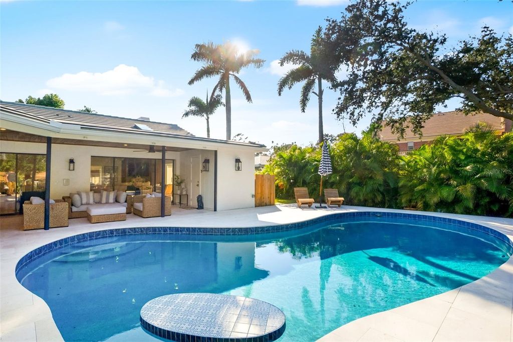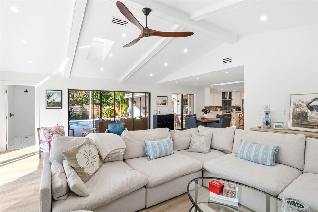 Welcome to this masterfully reimagined 3-bedroom, 3-bath residence in the prestigious, gated community of The Landings. Every detail of this home has been meticulously curated through a full-scale, down-to-the-studs renovation seamlessly blending timeless sophistication with today's most desirable comforts. Step inside to discover expansive, light-filled living spaces adorned with wide-plank luxury vinyl flooring backed with cork for exceptional comfort and durability. Thoughtful upgrades abound, including all-new electrical systems, energy-efficient LED lighting, and solid wood interior doors finished with designer Emtek hardware each element reflecting refined craftsmanship and enduring quality. The chef-inspired kitchen serves as the heart of the home, showcasing premium Bosch appliances, quartz countertops, a stylish apron-front sink, and a generous gathering island ideal for entertaining. The spa-worthy primary suite offers a serene retreat, featuring a freestanding soaking tub, custom built-in cabinetry, and a spacious walk-in closet. Each of the three bathrooms exudes understated elegance, highlighted by porcelain tile and elevated designer finishes. Outside, the property is equally impressive. A new roof and driveway, lush landscaping with professional lighting, and an upgraded well and irrigation system create a picture-perfect setting. The fully fenced backyard offers low-maintenance turf ideal for pets or play and a stunning chlorine pool with new surfacing, tile, and a heater/chiller for year-round enjoyment. The travertine paver patio provides both open-air and covered spaces for alfresco living, while the private entry courtyard with a tranquil fountain welcomes guests in true Florida style. Additional highlights include a well-appointed laundry room with extended countertops and a secondary refrigerator designed for both beauty and everyday ease. This residence exemplifies luxury living within one of Sarasota's most coveted communities where elegance, craftsmanship, and comfort converge.